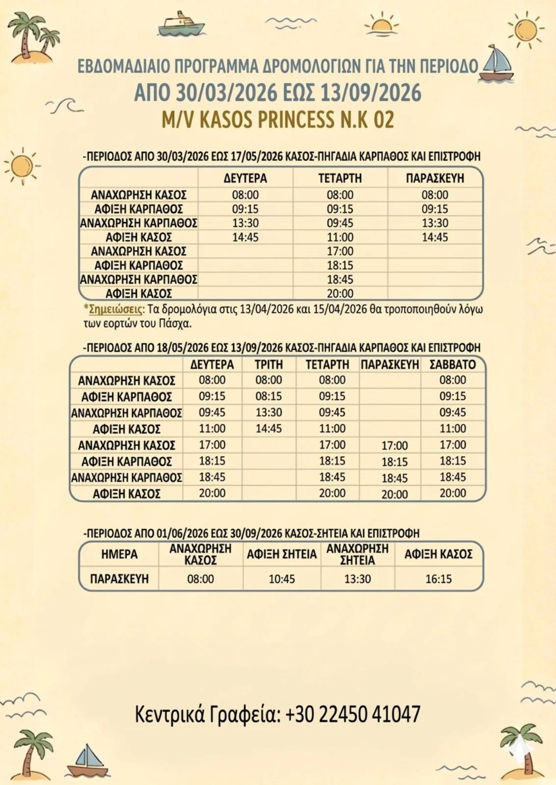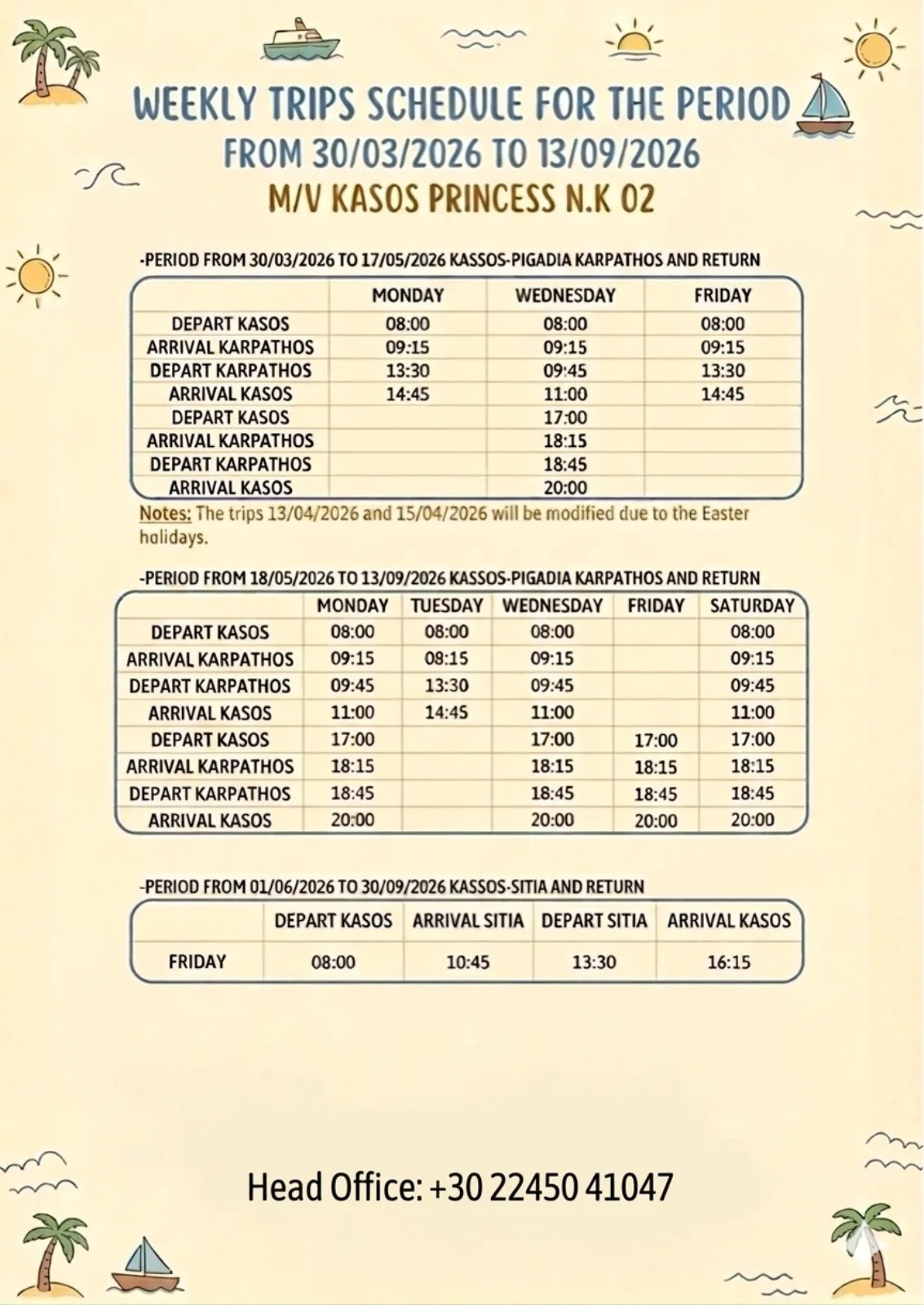 Before booking your tickets, we kindly recommend contacting the local travel agency via phone or email to check for any possible changes to the schedule, which may occur due to weather conditions, or public holidays.Phone: +302245041495 Email: smanusos@otenet.gr